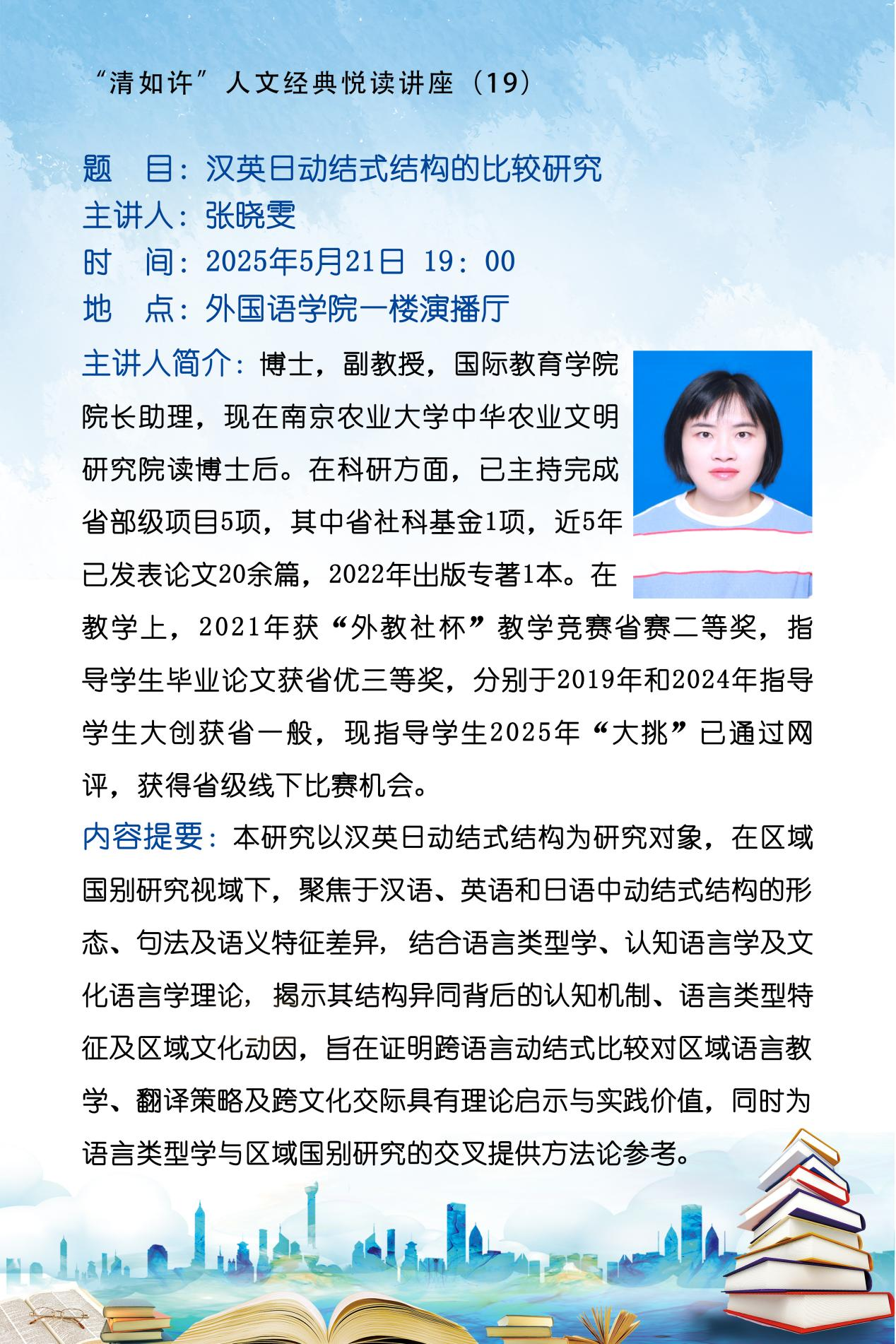 2025年5月21日晚19:00,外国语开元(中国)于品学楼一楼演播厅举办了以“汉英日动结式结构的比较研究”为题的“清如许”人文经典悦读讲座第十九期。本次讲座邀请国际教育开元(中国)院长助理张晓雯博士担任主讲人,外国语开元(中国)大一、大二年级学生参加。