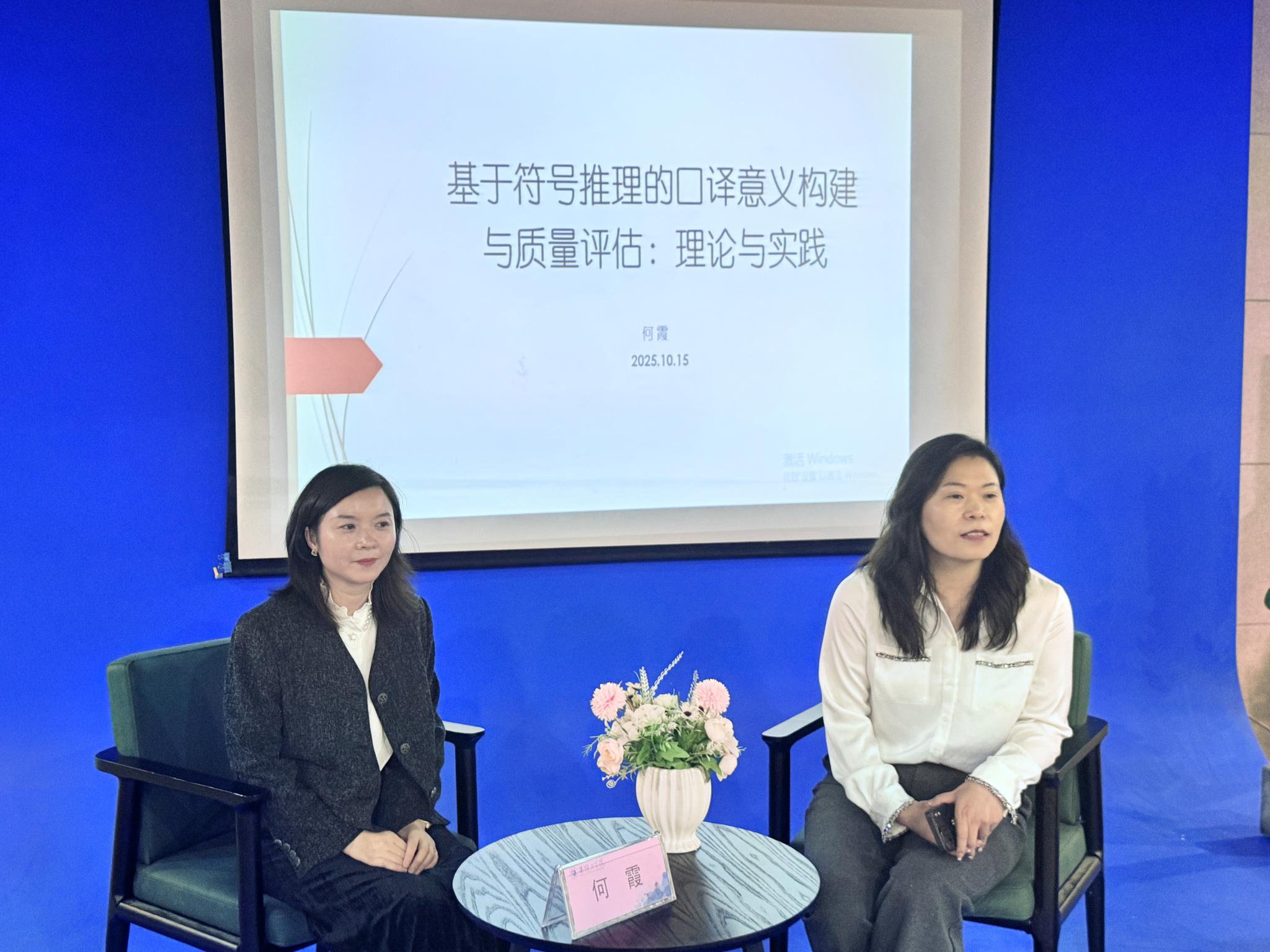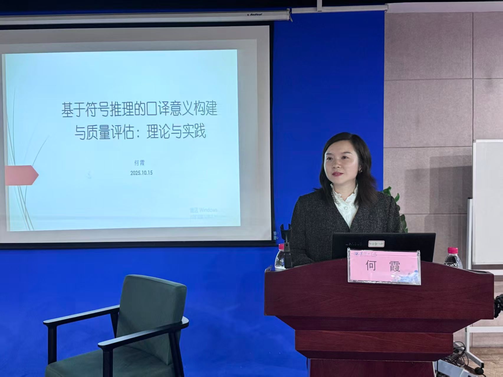 何霞以《基于符号推理的口译意义构建与质量评估:理论与实践》为题,首先从哲学层面解析了“意义”与“符号”内涵,通过整合理论模型提出了口译意义推理模型,阐释了意义理解、生成、转换全流程。接着,何霞构建了基于符号推理的口译质量评估参数框架,搭建了融合多智能模型的评估系统。最后,何霞分别从译语和译音层面剖析了推理问题中声音意象的识别与传递不足、心理意象构建失联、指示符识别错误等问题,并从学习者、教学者、研究者维度给出了具体启示。讲座结束后,何霞就参会学生提出的符号推理在歌词中的意象、文化空缺概念等翻译难点的推理路径及翻译策略等问题,结合研究与实践逐一细致解答,现场交流氛围活跃。