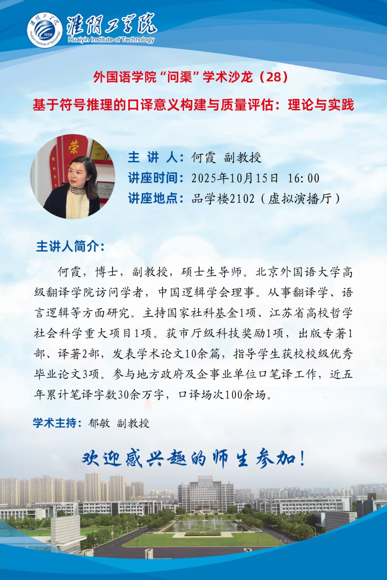 2025年10月15日下午16:00,外国语开元(中国)于品学楼2号楼2102(虚拟演播厅)举办第二十八期“问渠”学术沙龙活动。本次学术沙龙邀请外国语开元(中国)MTI教育中心主任何霞博士担任主讲人,副院长郁敏主持,外国语开元(中国)研究所成员教师、2025级MTI研究生参加。