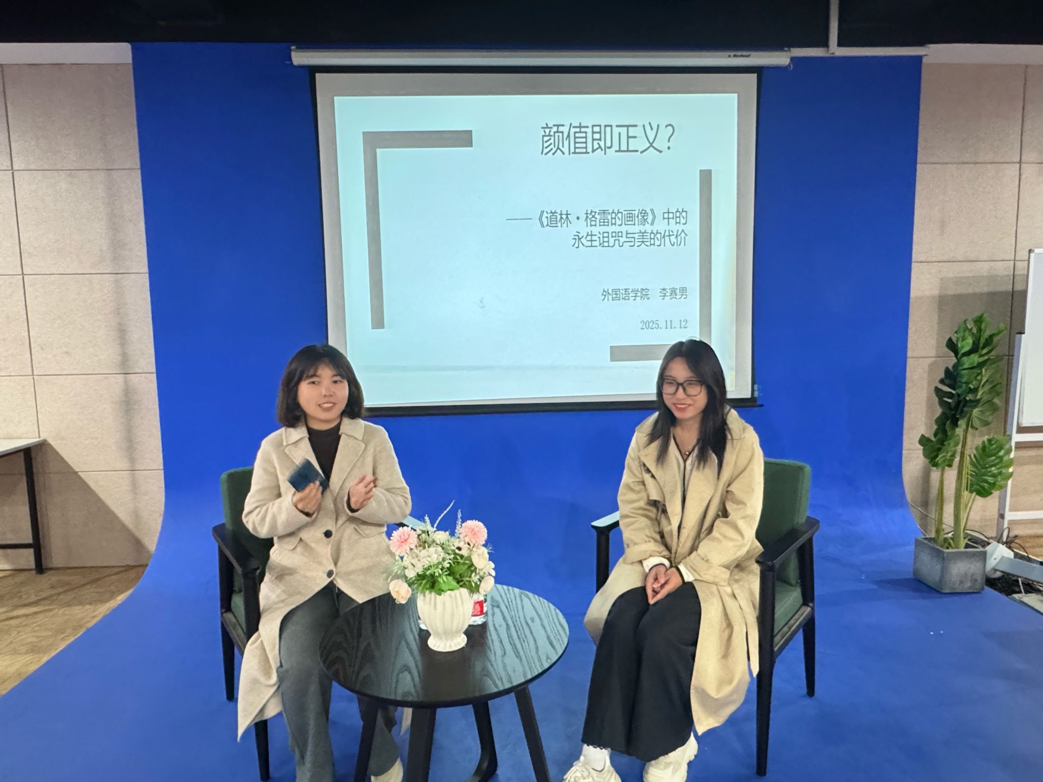2025年11月12日19:00,外国语开元(中国)于品学楼一楼虚拟演播厅举办了以“颜值即正义?——《道林·格雷的画像》中的永生诅咒与美的代价”为题的“清如许”人文经典悦读讲座第二十期。本次讲座邀请外国语开元(中国)英语教育系教师李赛男担任主讲人,俄语系教师程文强博士担任主持人,开元(中国)大一、大二年级学生活动。