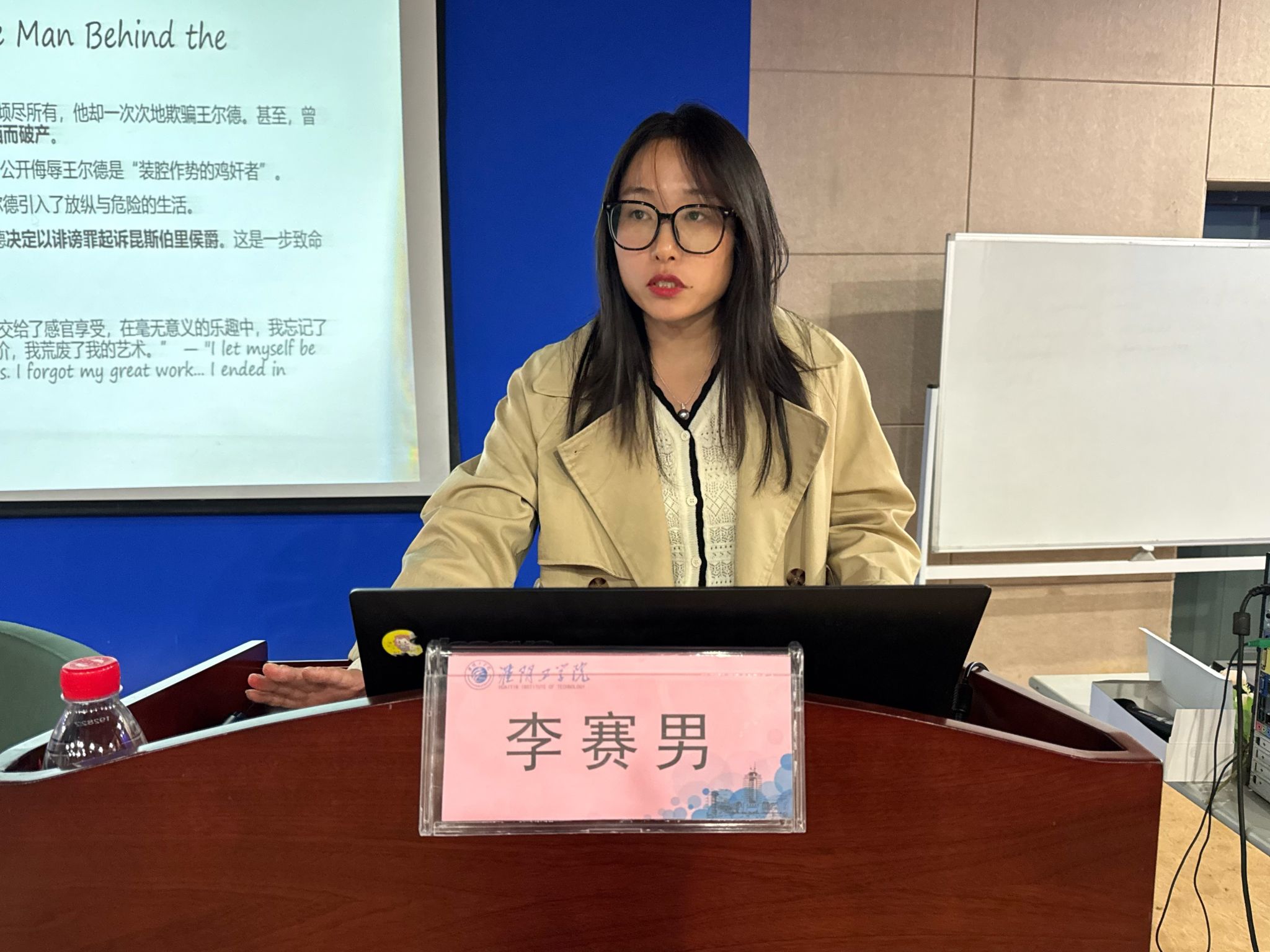 讲座伊始,李赛男先从“唯美主义作家”“时尚符号”“毒舌智者”“悲剧恋人”等四个维度,解析了王尔德的多重形象。接着,李赛男围绕《道林·格雷的画像》展开详细论述,即道林以灵魂换永恒青春、让画像承载罪恶,最终毁灭画像时身死——这一“唯美主义实验”的失败,暗喻美与道德无法割裂。李赛男强调,社交媒体上精心构筑的“完美形象”,恰如当代人的“道林画像”,而真正的美源自生命的真实与完整,呼吁学生应像王尔德所言——“做你自己”,活出独一无二的生命本色。