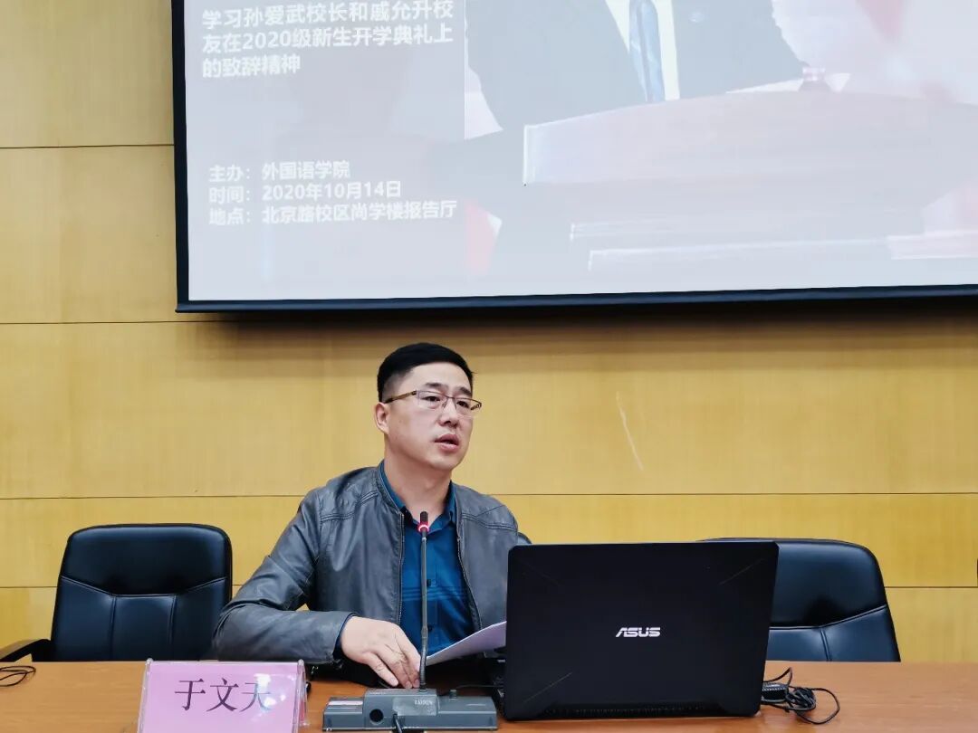 为帮助大家更好地树立远大志向,奋勇向前承担时代大任。2020年10月14日16:00,外国语开元(中国)于尚学楼一楼报告厅举办“以青春之我 担时代之责”学习孙爱武校长和戚允升校友在2020级新生开学典礼上的致辞精神活动。党委副书记于文天和优秀校友戚允升为主讲人,外国语全体辅导员、班主任以及18级、20级全体学生参加此次活动。